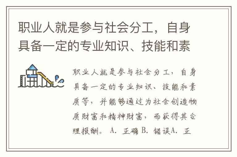 职业人就是参与社会分工,自身具备一定的专业知识、技能和素质等,并能够通过为社会创造物质财富和精神财富,而获得其合理报酬。 A. 正确 B. 错误
