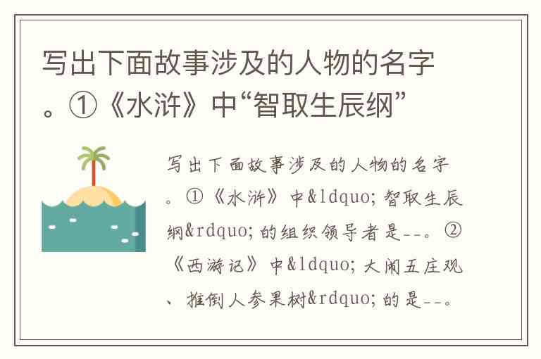 写出下面故事涉及的人物的名字。①《水浒》中“智取生辰纲”的组织领导者是__。②《西游记》中“大闹五庄观、推倒人参果树”的是__。