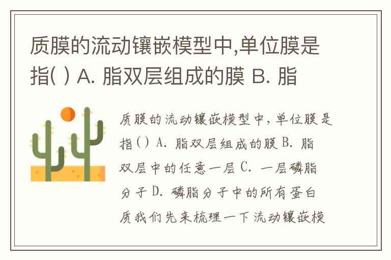 质膜的流动镶嵌模型中,单位膜是指( ) A. 脂双层组成的膜 B. 脂双层中的任意一层 C. 一层磷脂分子 D. 磷脂分子中的所有蛋白质