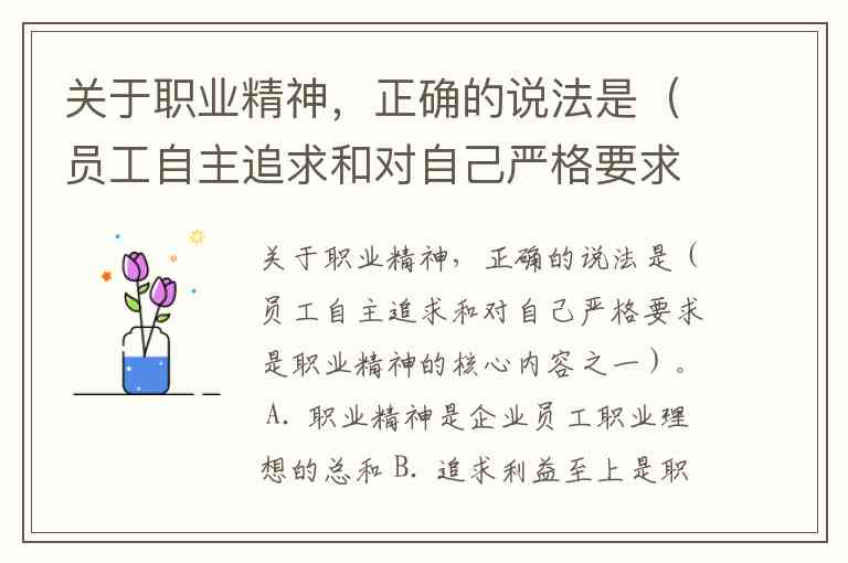 关于职业精神,正确的说法是(员工自主追求和对自己严格要求是职业精神的核心内容之一)。 A. 职业精神是企业员工职业理想的总和 B. 追求利益至上是职业精神的本质 C. 员工自主追求和对自己严格要求是职业精神的核心内容之一 D. 任何企业都有自己独特的职业精神
