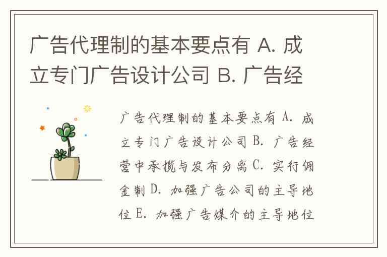 广告代理制的基本要点有 A. 成立专门广告设计公司 B. 广告经营中承揽与发布分离 C. 实行佣金制 D. 加强广告公司的主导地位 E. 加强广告媒介的主导地位