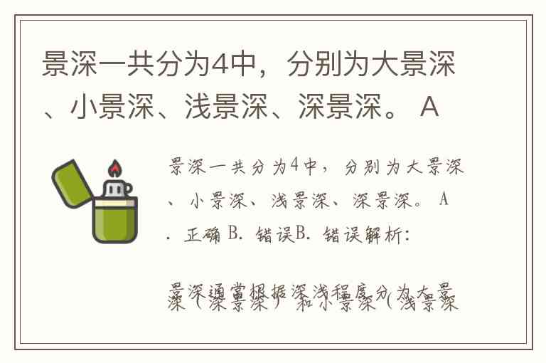 解析:景深通常根据深浅程度分为大景深(深景深) 和小景深(浅景深),它们是相对概念,并非四种独立的类型。题目中提到的“大景深”“小景深”“浅景深”“深景深”实际上是将同一概念用不同说法重复列出,造成分类混乱。