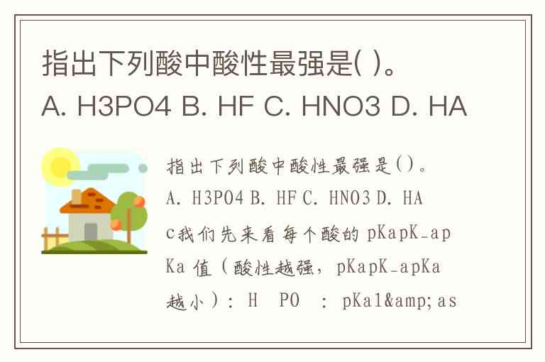 指出下列酸中酸性最强是( )。 A. H3PO4 B. HF C. HNO3 D. HAc