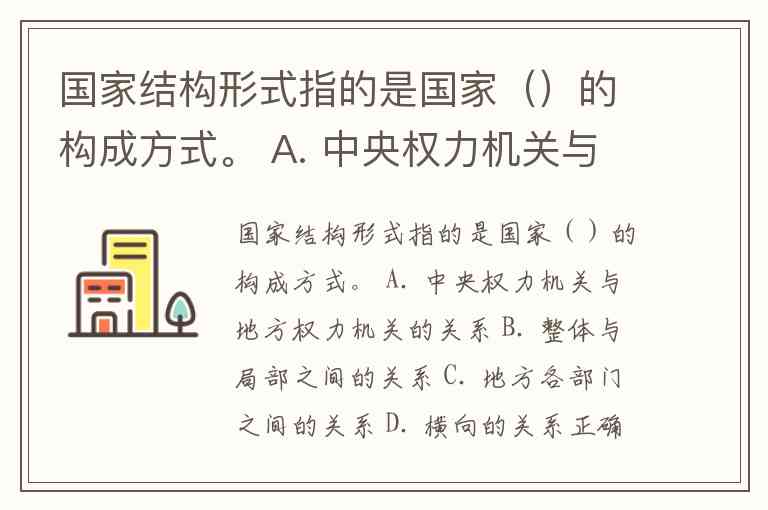国家结构形式指的是国家()的构成方式。 A. 中央权力机关与地方权力机关的关系 B. 整体与局部之间的关系 C. 地方各部门之间的关系 D. 横向的关系