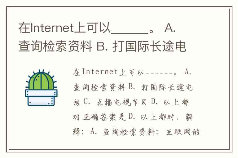 在Internet上可以______。 A. 查询检索资料 B. 打国际长途电话 C. 点播电视节目 D. 以上都对