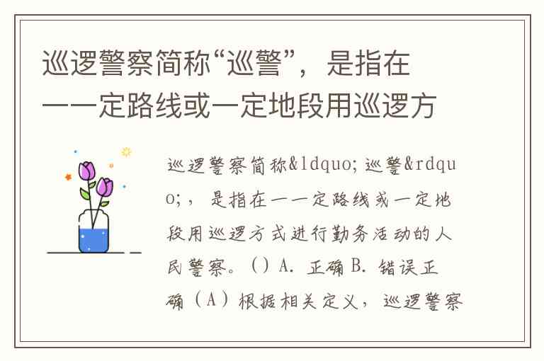 巡逻警察简称“巡警”,是指在一一定路线或一定地段用巡逻方式进行勤务活动的人民警察。( ) A. 正确 B. 错误