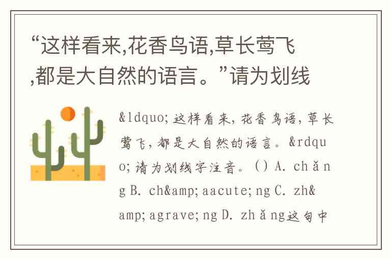 “这样看来,花香鸟语,草长莺飞,都是大自然的语言。”请为划线字注音。( ) A. chǎng B. cháng C. zhàng D. zhǎng