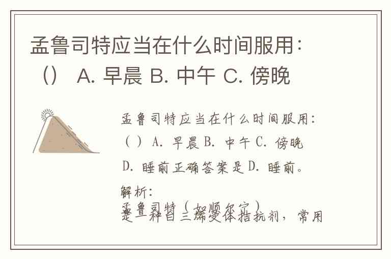 孟鲁司特应当在什么时间服用:() A. 早晨 B. 中午 C. 傍晚 D. 睡前