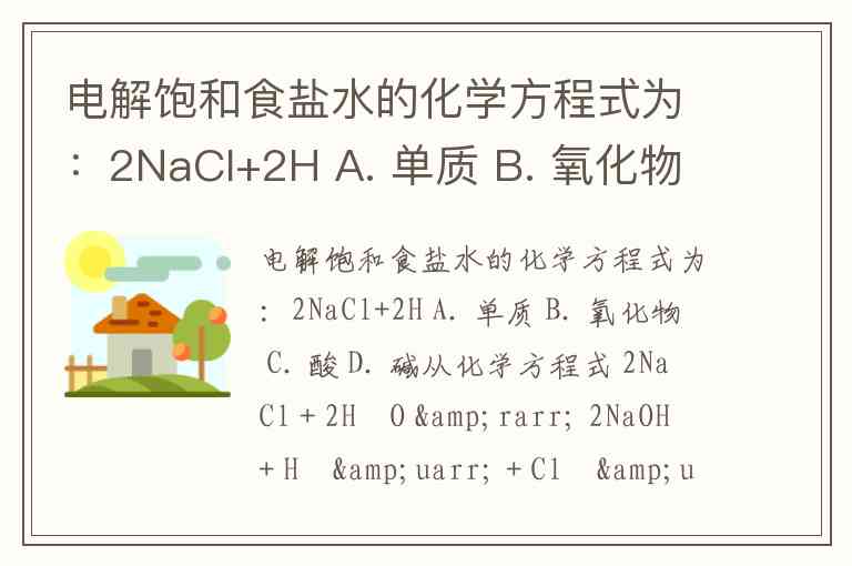 电解饱和食盐水的化学方程式为:2NaCl+2H A. 单质 B. 氧化物 C. 酸 D. 碱
