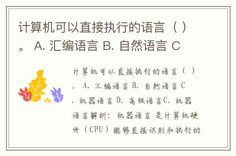 计算机可以直接执行的语言( )。 A. 汇编语言 B. 自然语言 C. 机器语言 D. 高级语言