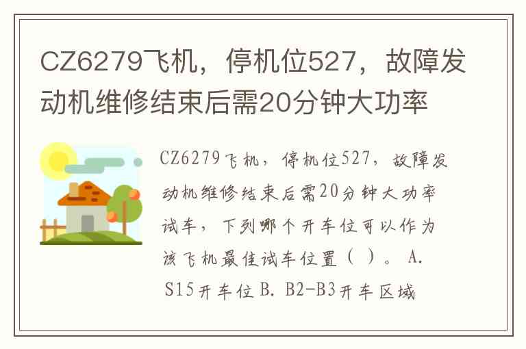 CZ6279飞机,停机位527,故障发动机维修结束后需20分钟大功率试车,下列哪个开车位可以作为该飞机最佳试车位置( )。 A. S15开车位 B. B2-B3开车区域 C. 521-526开车区域 D. L3开车位