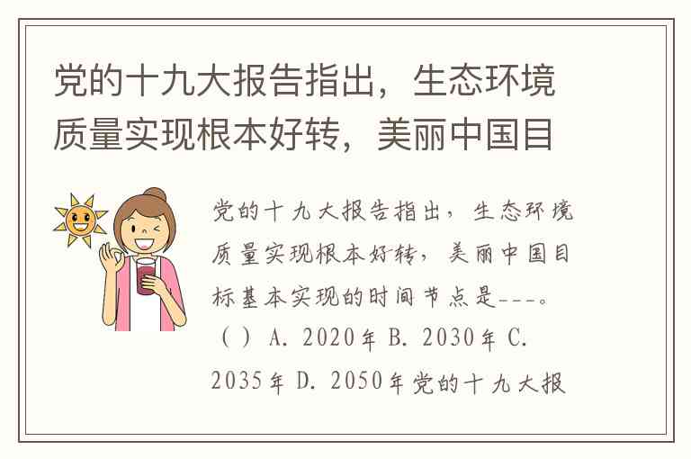 党的十九大报告指出,生态环境质量实现根本好转,美丽中国目标基本实现的时间节点是___。 () A. 2020年 B. 2030年 C. 2035年 D. 2050年