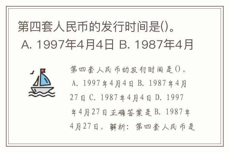 第四套人民币的发行时间是()。 A. 1997年4月4日 B. 1987年4月27日 C. 1987年4月4日 D. 1997年4月27日