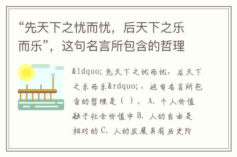 “先天下之忧而忧,后天下之乐而乐”,这句名言所包含的哲理是( )。 A. 个人价值融于社会价值中 B. 人的自由是相对的 C. 人的发展具有历史阶段性 D. 社会发展要以人为本
