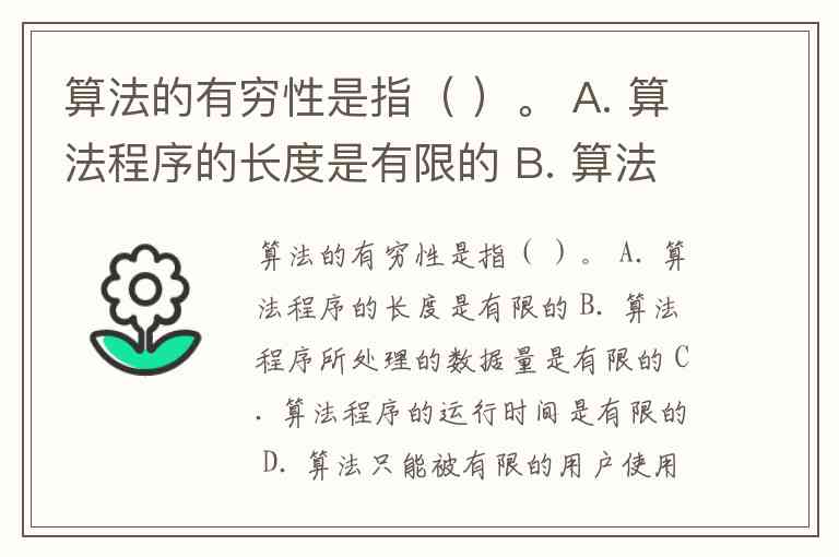 算法的有穷性是指( )。 A. 算法程序的长度是有限的 B. 算法程序所处理的数据量是有限的 C. 算法程序的运行时间是有限的 D. 算法只能被有限的用户使用