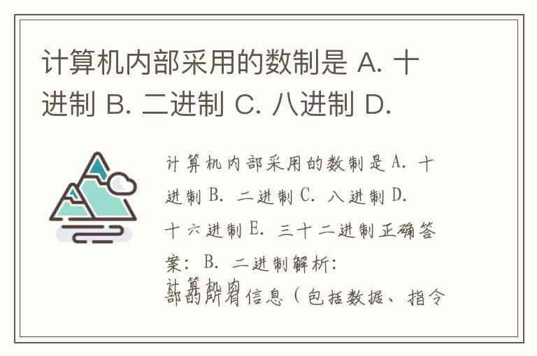 计算机内部采用的数制是 A. 十进制 B. 二进制 C. 八进制 D. 十六进制 E. 三十二进制