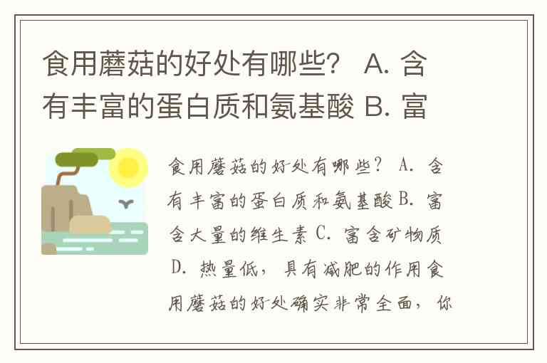 食用蘑菇的好处有哪些? A. 含有丰富的蛋白质和氨基酸 B. 富含大量的维生素 C. 富含矿物质 D. 热量低,具有减肥的作用