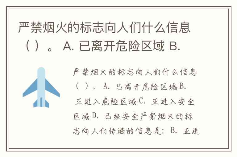 严禁烟火的标志向人们什么信息( )。 A. 已离开危险区域 B. 正进入危险区域 C. 正进入安全区域 D. 已经安全