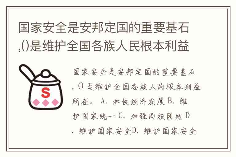 国家安全是安邦定国的重要基石,()是维护全国各族人民根本利益所在。 A. 加快经济发展 B. 维护国家统一 C. 加强民族团结 D. 维护国家安全