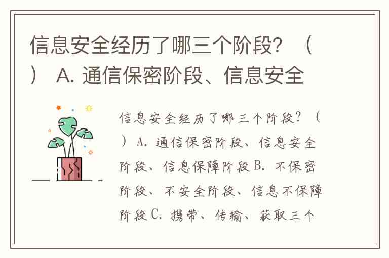 信息安全经历了哪三个阶段?() A. 通信保密阶段、信息安全阶段、信息保障阶段 B. 不保密阶段、不安全阶段、信息不保障阶段 C. 携带、传输、获取三个阶段