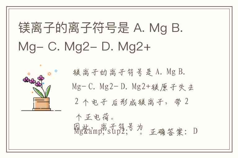镁离子的离子符号是 A. Mg B. Mg- C. Mg2- D. Mg2+