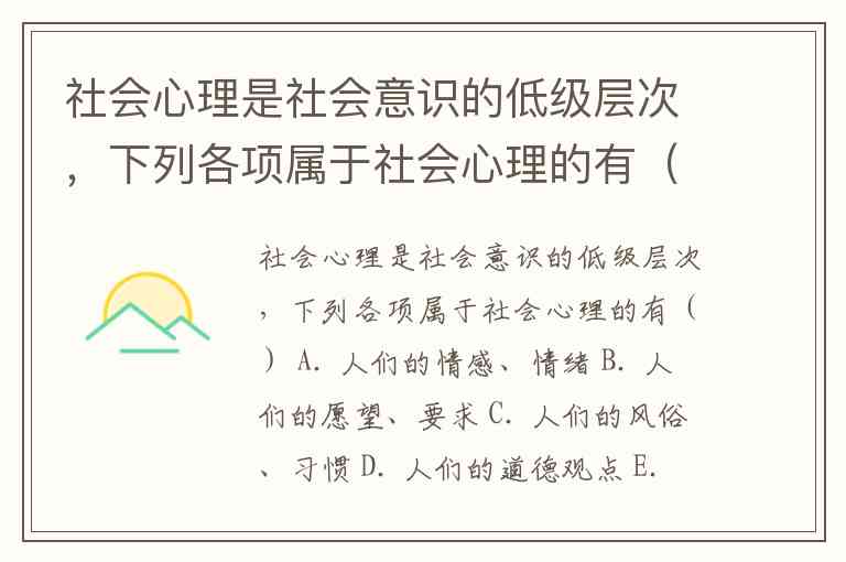 社会心理是社会意识的低级层次,下列各项属于社会心理的有() A. 人们的情感、情绪 B. 人们的愿望、要求 C. 人们的风俗、习惯 D. 人们的道德观点 E. 人们的艺术观点