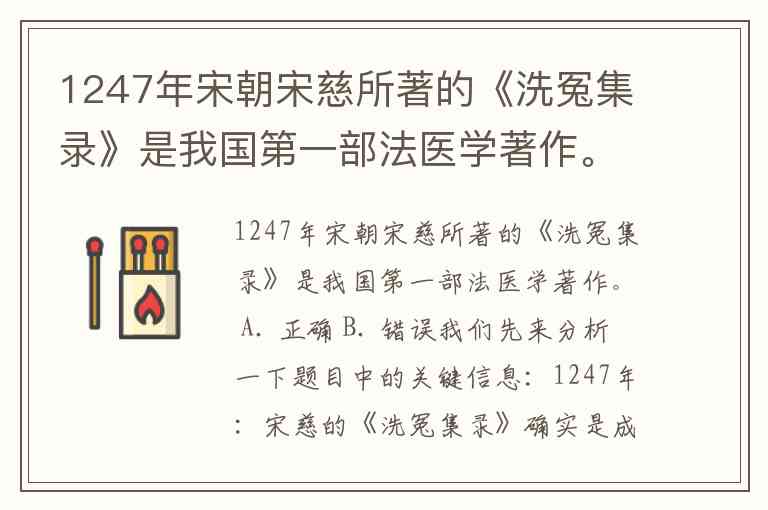 1247年宋朝宋慈所著的《洗冤集录》是我国第一部法医学著作。 A. 正确 B. 错误