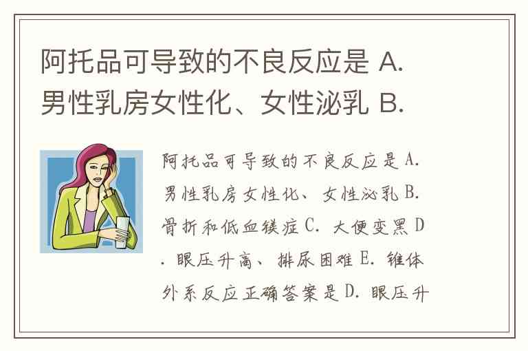 阿托品可导致的不良反应是 A. 男性乳房女性化、女性泌乳 B. 骨折和低血镁症 C. 大便变黑 D. 眼压升高、排尿困难 E. 锥体外系反应