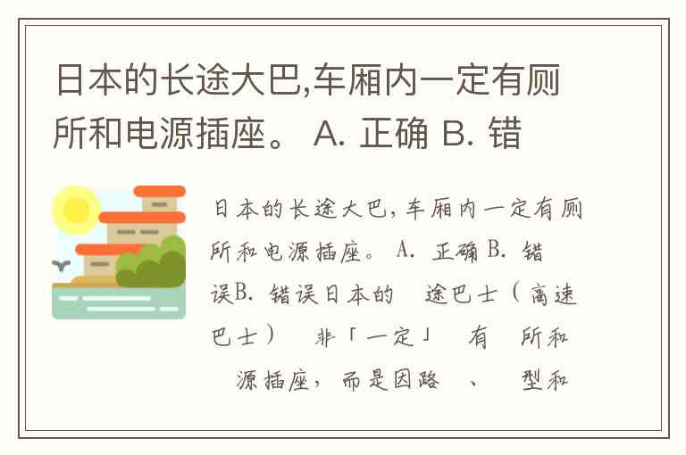 日本的长途大巴,车厢内一定有厕所和电源插座。 A. 正确 B. 错误