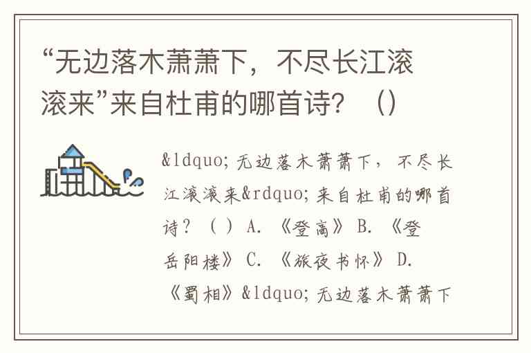 “无边落木萧萧下,不尽长江滚滚来”来自杜甫的哪首诗?() A. 《登高》 B. 《登岳阳楼》 C. 《旅夜书怀》 D. 《蜀相》