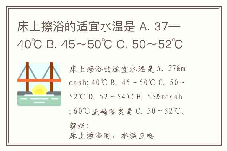 床上擦浴的适宜水温是 A. 37—40℃ B. 45~50℃ C. 50~52℃ D. 52~54℃ E. 55—60℃