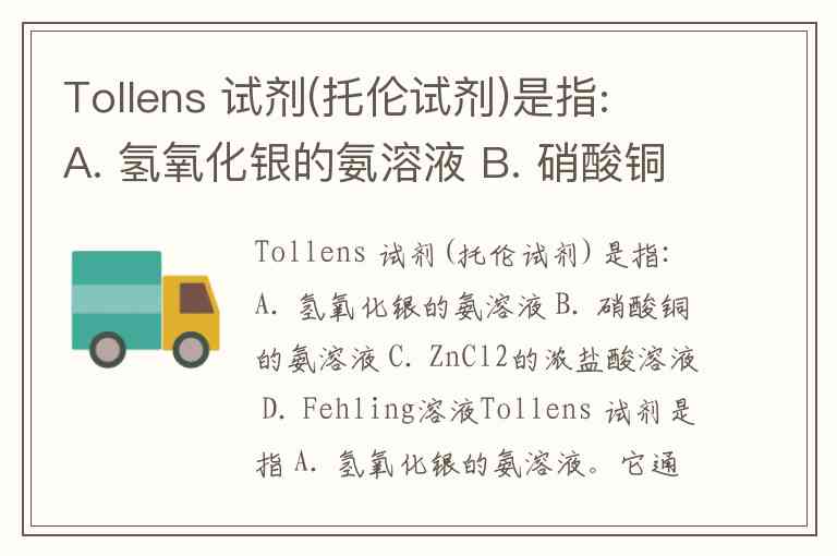 Tollens 试剂(托伦试剂)是指: A. 氢氧化银的氨溶液 B. 硝酸铜的氨溶液 C. ZnCl2的浓盐酸溶液 D. Fehling溶液
