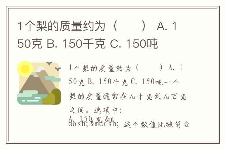 一个梨的质量通常在几十克到几百克之间。选项中:A. 150 克 —— 这个数值比较符合一个中等大小梨的实际质量。B. 150 千克 —— 这相当于两个成年人的体重,显然不对。C. 150 吨 —— 相当于大型卡车的重量,更不合理。
