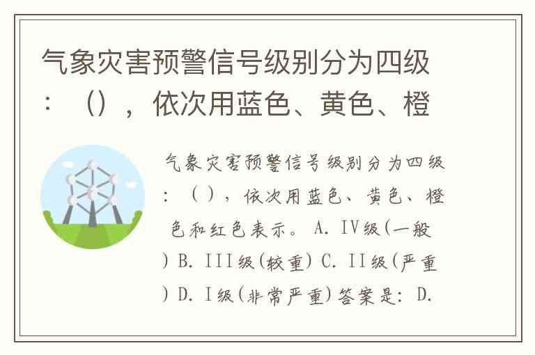 气象灾害预警信号级别分为四级:(),依次用蓝色、黄色、橙 色和红色表示。 A. IV级(一般) B. III级(较重) C. II级(严重) D. I级(非常严重)