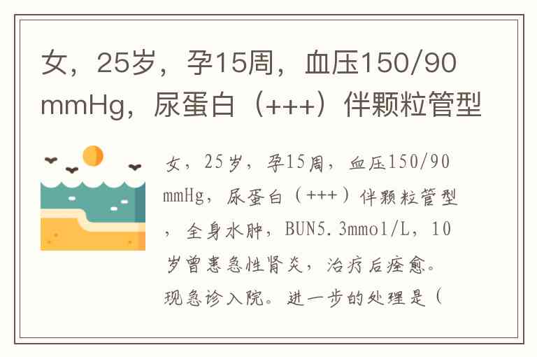 核心诊断:患者25岁,孕15周(妊娠中期),出现了严重的高血压(150/90mmHg)、大量蛋白尿(+++)伴颗粒管型、全身水肿。