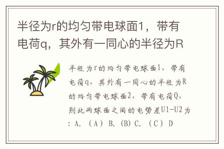 半径为r的均匀带电球面1,带有电荷q,其外有一同心的半径为R的均匀带电球面2,带有电荷Q,则此两球面之间的电势差U1-U2为: A. (A) B. (B) C. (C) D. (D)