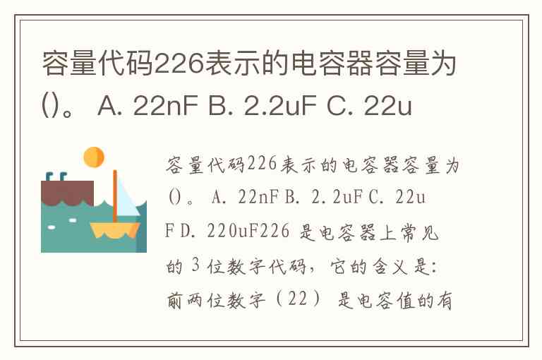 容量代码226表示的电容器容量为()。 A. 22nF B. 2.2uF C. 22uF D. 220uF