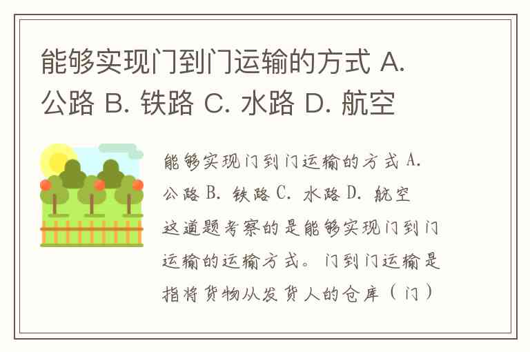 能够实现门到门运输的方式 A. 公路 B. 铁路 C. 水路 D. 航空