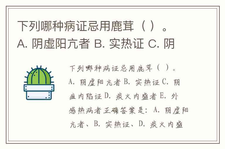 下列哪种病证忌用鹿茸( )。 A. 阴虚阳亢者 B. 实热证 C. 阴疽内陷证 D. 痰火内盛者 E. 外感热病者