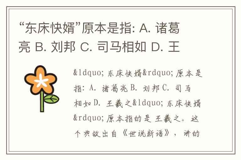 “东床快婿”原本是指: A. 诸葛亮 B. 刘邦 C. 司马相如 D. 王羲之