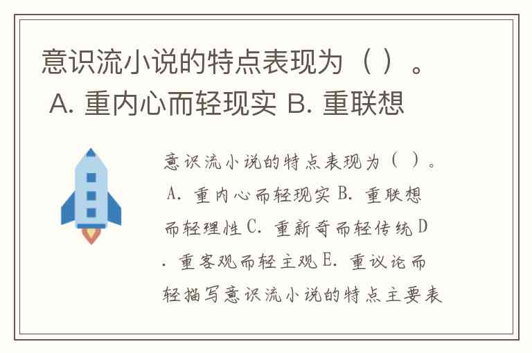 意识流小说的特点表现为( )。 A. 重内心而轻现实 B. 重联想而轻理性 C. 重新奇而轻传统 D. 重客观而轻主观 E. 重议论而轻描写