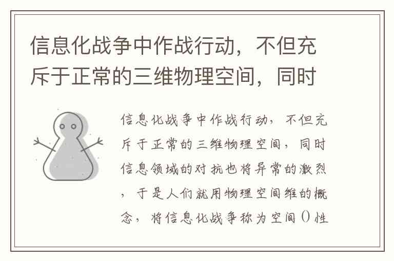 信息化战争中作战行动,不但充斥于正常的三维物理空间,同时信息领域的对抗也将异常的激烈,于是人们就用物理空间维的概念,将信息化战争称为空间()性的战争。 A. 一维 B. 两维 C. 三维 D. 多维