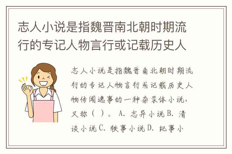 志人小说是指魏晋南北朝时期流行的专记人物言行或记载历史人物传闻逸事的一种杂录体小说,又称( )。 A. 志异小说 B. 清谈小说 C. 轶事小说 D. 纪事小说