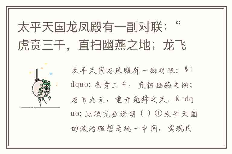 太平天国龙凤殿有一副对联:“虎贲三千,直扫幽燕之地;龙飞九五,重开尧舜之天。”此联充分说明()①太平天国的政治理想是统一中国,实现民主②太平天国领袖存在封建意识③太平天国领袖希望推翻清朝统治,建立太平盛世④太平天国具有反封建反侵略性质。 A. ①②③④ B. ②③④ C. ②③ D. ③④