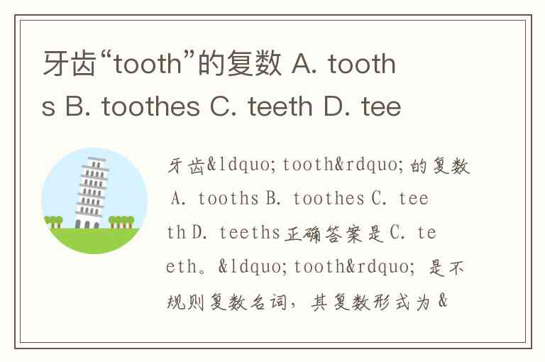 牙齿“tooth”的复数 A. tooths B. toothes C. teeth D. teeths