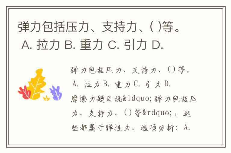 弹力包括压力、支持力、( )等。 A. 拉力 B. 重力 C. 引力 D. 摩擦力