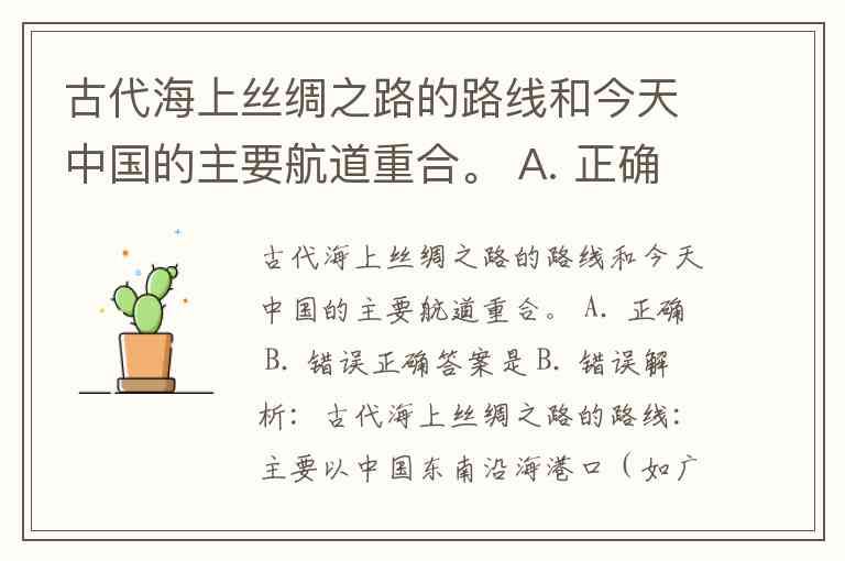 古代海上丝绸之路的路线和今天中国的主要航道重合。 A. 正确 B. 错误