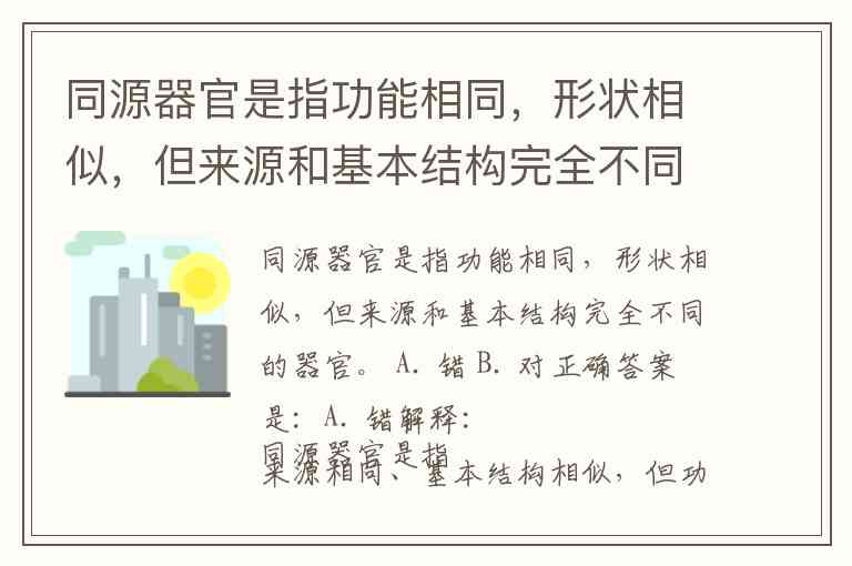 解释:同源器官是指来源相同、基本结构相似,但功能不一定相同的器官,例如鸟的翅膀和人的手臂,它们骨骼结构相似,但功能不同。题中的描述“功能相同,形状相似,但来源和基本结构完全不同”实际上对应的是同功器官,而不是同源器官。