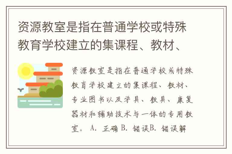 资源教室是指在普通学校或特殊教育学校建立的集课程、教材、专业图书以及学具、教具、康复器材和辅助技术与一体的专用教室。 A. 正确 B. 错误