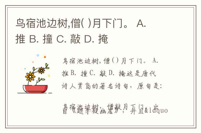 鸟宿池边树,僧( )月下门。 A. 推 B. 撞 C. 敲 D. 掩